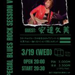 前回大変好評だった ブルースロックセッションWith安達久美を 再度開催いたします。 ギタリスト安達久美さんをゲストにお迎えしてのセッションです。 3コードのブルースや有名なロックナンバー (Little wing,Purple haze,Going downなど)を 久美さんと一緒にセッションで楽しみましょう。 もちろん見学のみの方も大歓迎です。 ご予約ご希望の方は このページを参加予定にして頂くか お店にご連絡してください。 皆様のご参加をお待ちしております。 進行 (G.vo)寺島幸市 (G.vo)横井竜也 (B)松原史和 (Dr)翔くん 20時オープン 20時30分スタート 23時00分終了 料金 予約 3,000円(1ドリンク付き) 当日 3500円(1ドリンク付き)